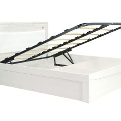 Эта модель, без сомнения, станет главным украшением вашей спальни: выбеленный оттенок, изящное изголовье с мягкой вставкой, резные детали.
